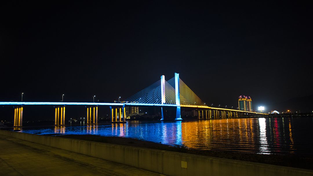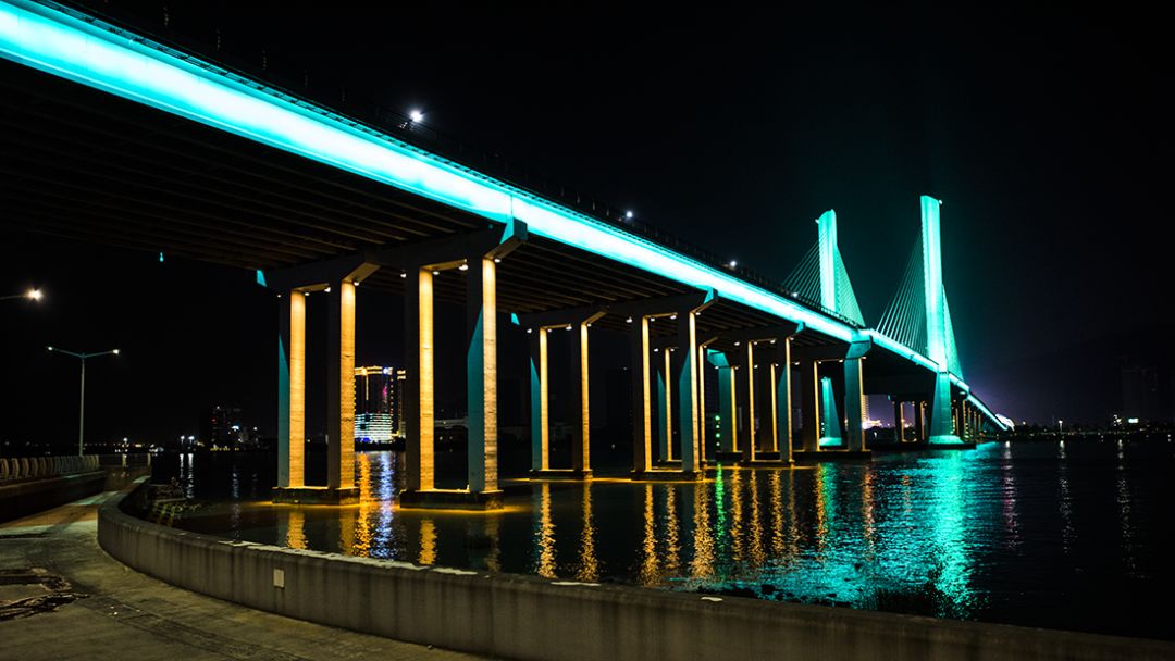 2019年3月,橫琴大橋亮化提升工程進入施工階段,并于2019年6月建設完成。20年后,作為當時橫琴的標志性建筑,如今在燈光的裝飾下重現(xiàn)風采。三種模式 各具特色橫琴大橋亮化提升工程主要包括照明燈具布置、照明配電及控制施工。工程范圍總長度約為1405米,涵蓋橋身、引橋、橋腹、橋墩等。其中橋腹安裝LED投光燈592套,鋪設金屬線管11000米,敷設電纜15100米。