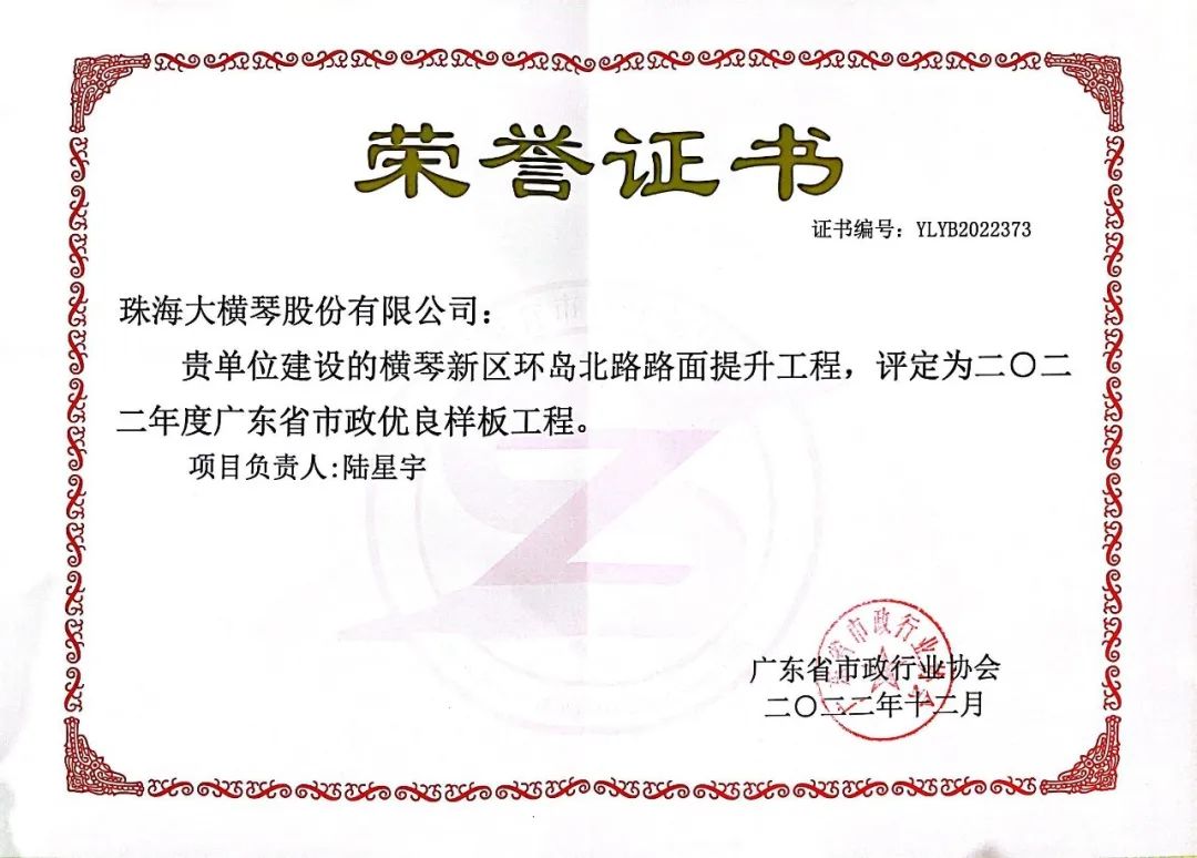 近期,廣東省市政行業(yè)協(xié)會公布了2022年度廣東省市政優(yōu)良樣板工程獲獎名單,由大橫琴股份建設(shè)的環(huán)島北路路面提升工程項目喜獲殊榮。